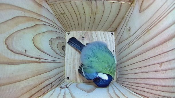 Mésange Charbonnière qui regarde l'éclairage LED dans le Nichoir du Cerisier