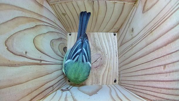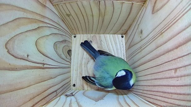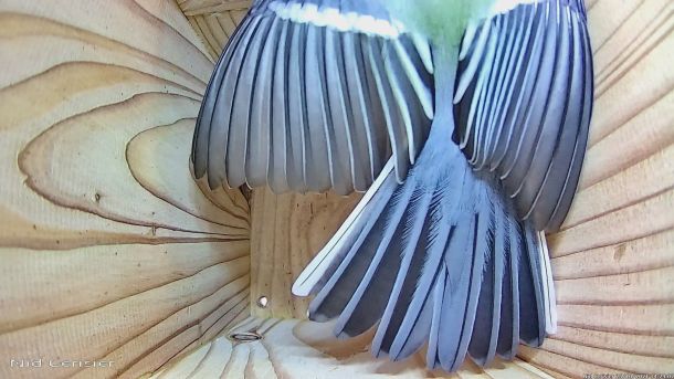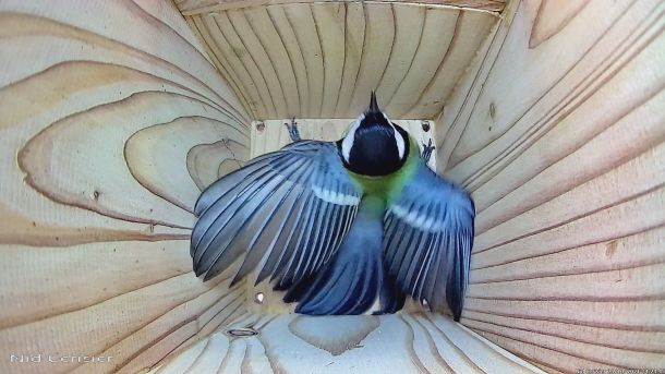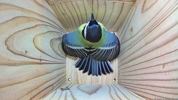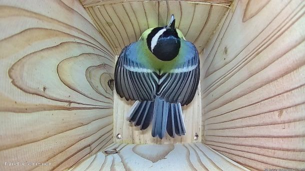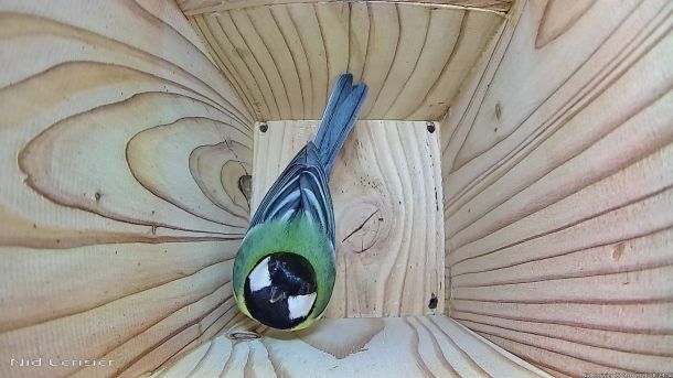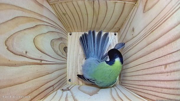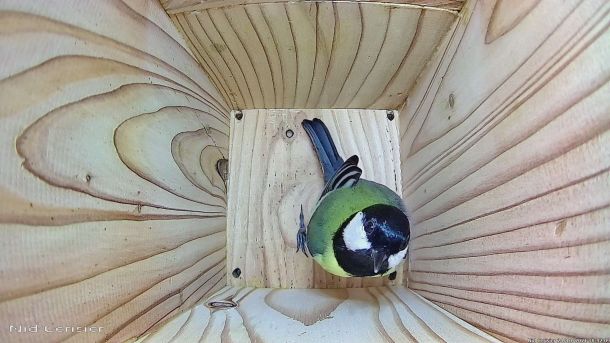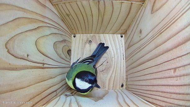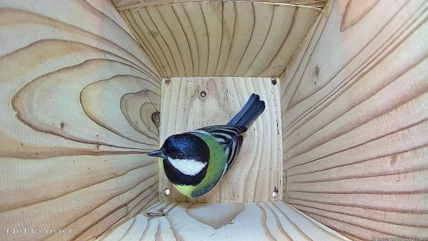 Mésange Charbonnière qui passe à l'attaque d'un intrus qui est rentré dans le Nichoir du Cerisier