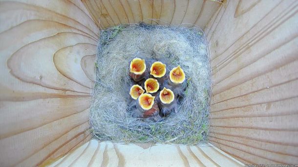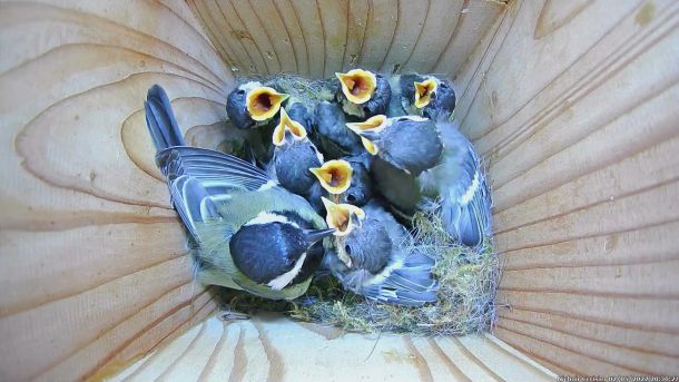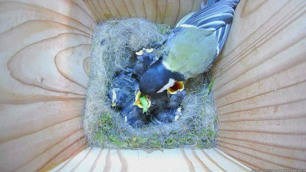 Oisillons de Mésanges Charbonnières qui ont faim dans le Nichoir du Cerisier (Septième jour)
