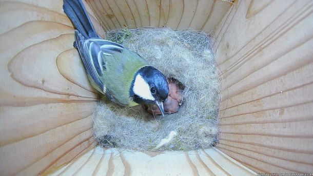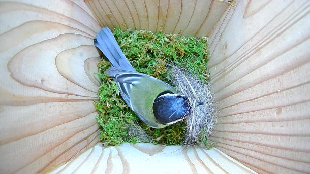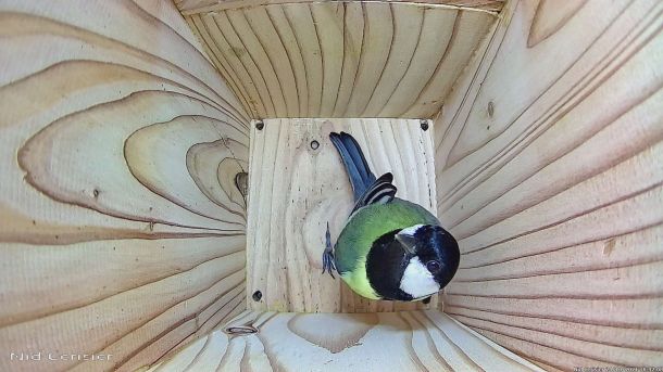 Mésange Charbonnière qui regarde la Caméra dans le Nichoir du Cerisier