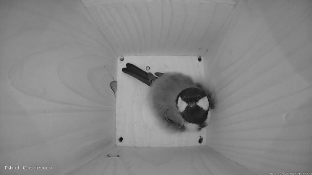 Mésange Charbonnière qui sort de son sommeil parce qu'elle a entendu le bruit de la Caméra qui vient de basculer en mode Nuit dans le Nichoir du Cerisier