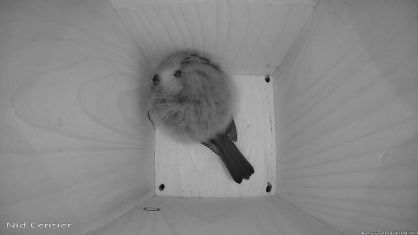 Mésange Charbonnière qui dort en boule dans le Nichoir du Cerisier