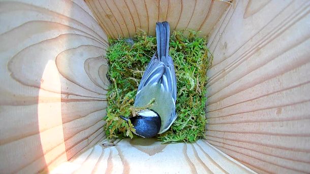 Préparation du Nid de Zoé la Mésange charbonnière dans le Nichoir du Cerisier