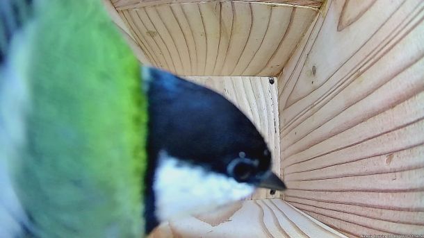 Mésange Charbonnière qui se fait un selfie devant l'objectif de la caméra dans le nichoir du cerisier