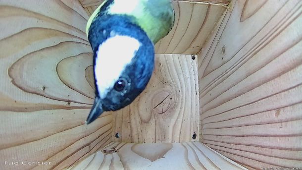 Mésange Charbonnière qui regarde la Caméra dans le Nichoir du Cerisier