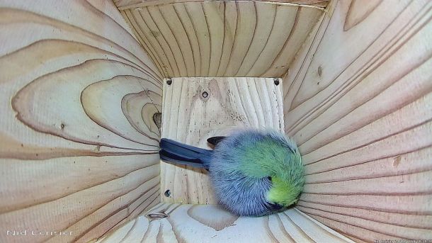Mésange Charbonnière qui dort en boule dans le Nichoir du Cerisier