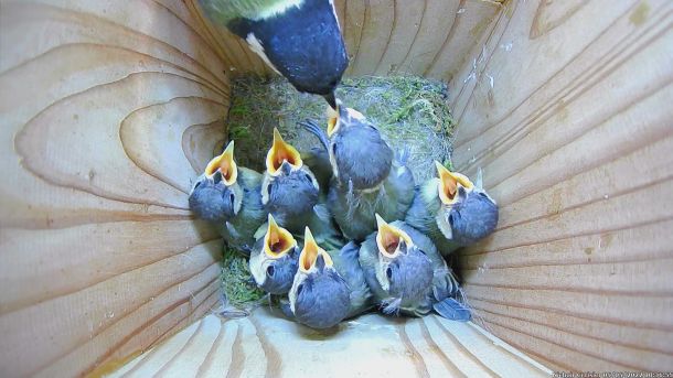 Oisillons de Mésanges Charbonnières qui ont faim dans le Nichoir du Cerisier (Septième jour)